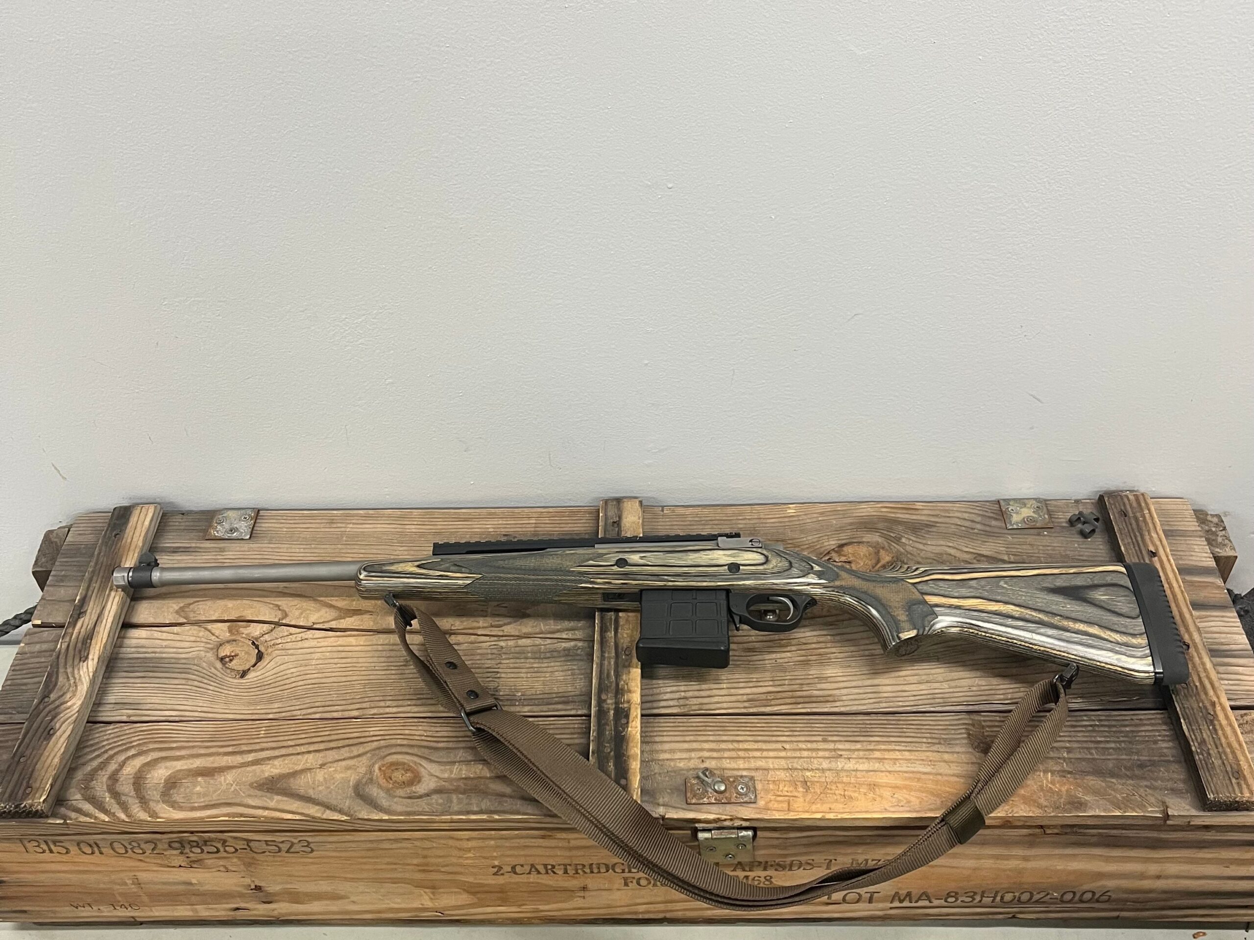 Ruger Gunsight Scout 18″ Bolt Action .308 Rifle, Stainless Steel Barrel, Wood Laminate Stock, w/ XS Sight Full Length Rail, (1) 10rd Mag, No Bag